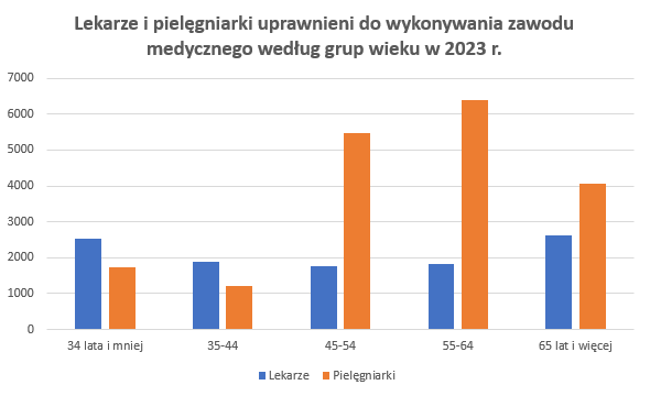 W 2024 r. niedobór pielęgniarek pracujących bezpośrednio z pacjentem był wśród regionów Polski najwyższy w województwie pomorskim. Również dostępność położnych uplasowała Pomorskie w dolnych rejestrach w porównaniu z innymi województwami. Na wysoką deficytowość w grupie zawodowej pielęgniarek i położnych wskazało także badanie pn. „Barometr Zawodów 2025 Edycja X”. Wskazane braki kadrowe występują we wszystkich powiatach województwa. Zagrożenia wynikające z zobrazowanego niedoboru potęguje wiek pracujących lekarzy i pielęgniarek, który ilustruje poniższy wykres.