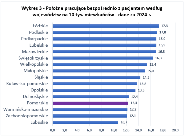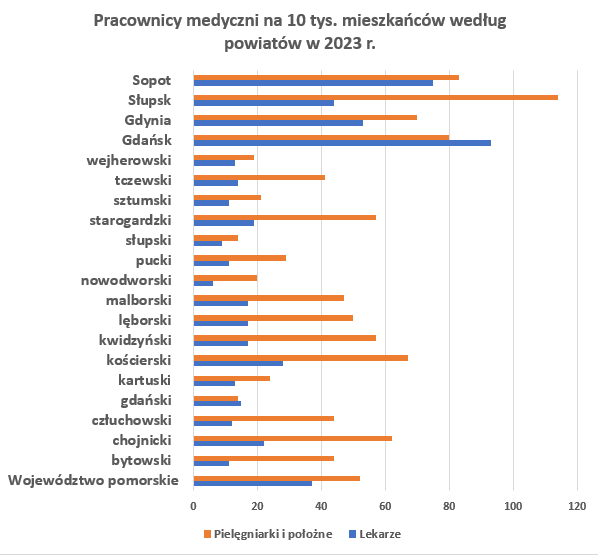Niedobór lekarzy i pielęgniarek to wyjątkowo dotkliwy problem, którego skala jest szczególnie wyraźna poza obszarem Trójmiasta i miasta Słupsk. Najmniej lekarzy w przeliczeniu na 10 tys. mieszkańców odnotowano w powiecie nowodworskim i słupskim. Najwyższy deficyt dla kategorii pielęgniarek i położnych zaobserwowano w powiatach gdańskim i słupskim.